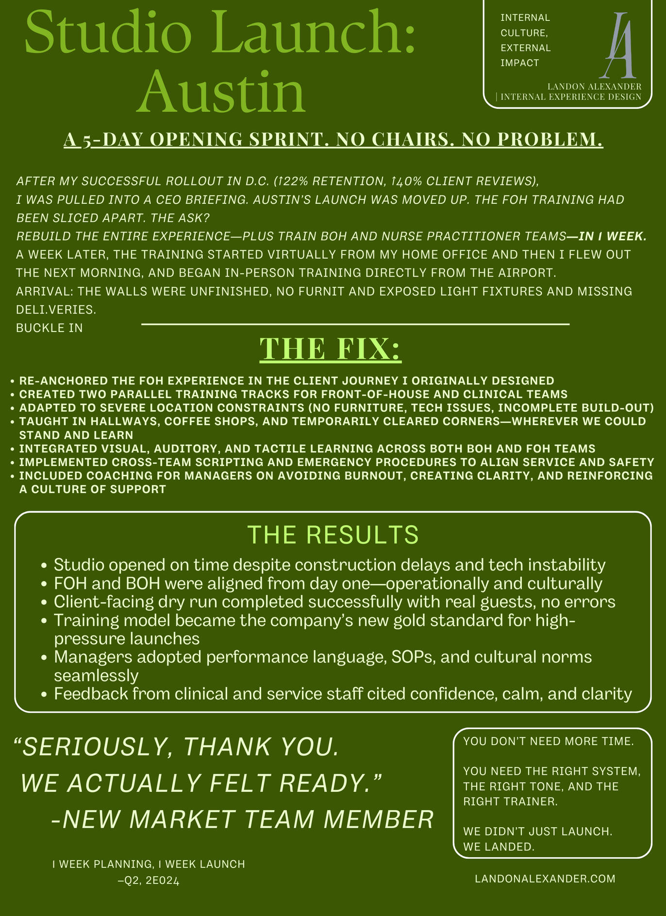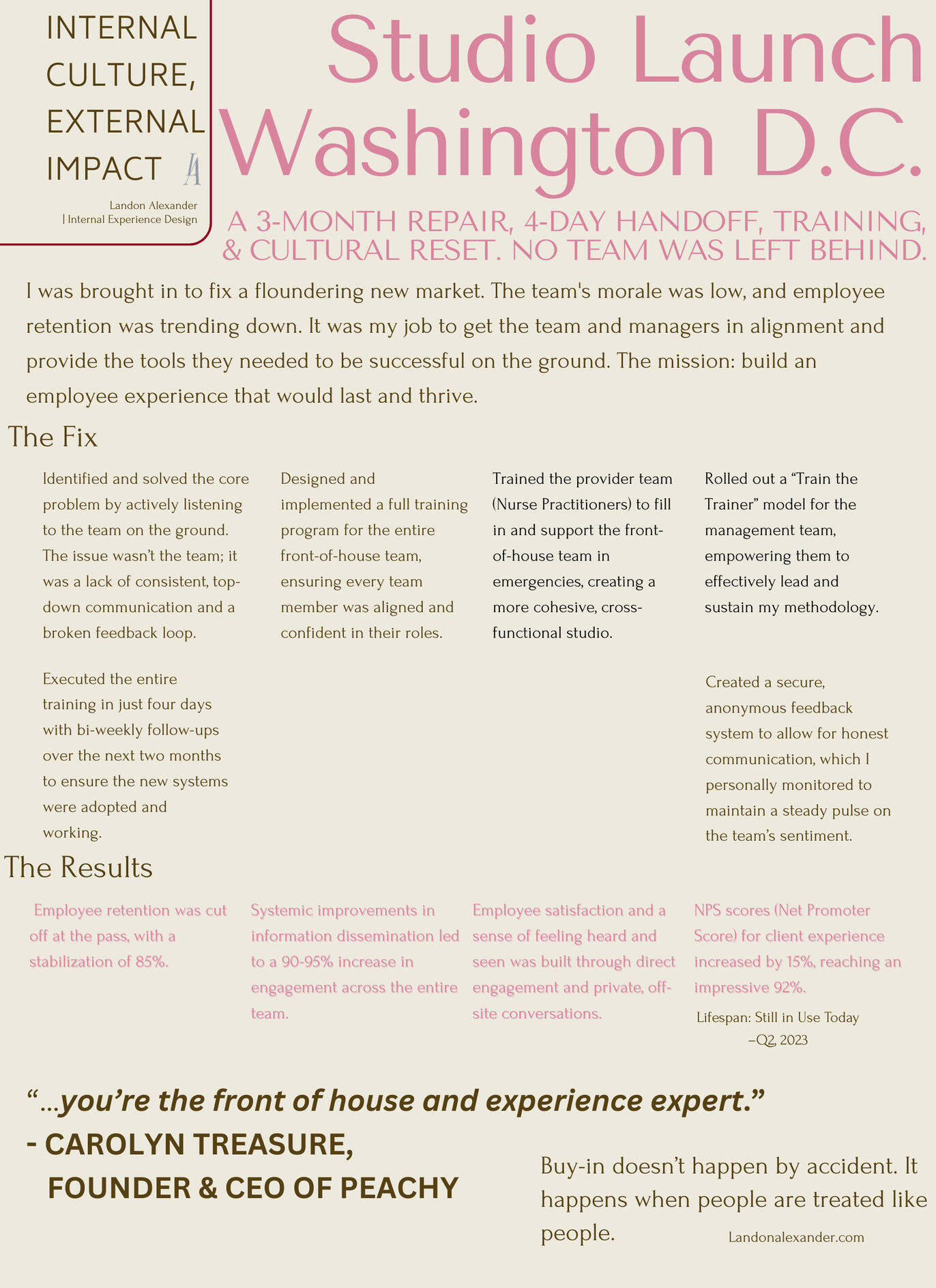 Washington, DC Studio LaunchBuilt a confident, aligned team culture under high-pressure launch conditions.Highlights: