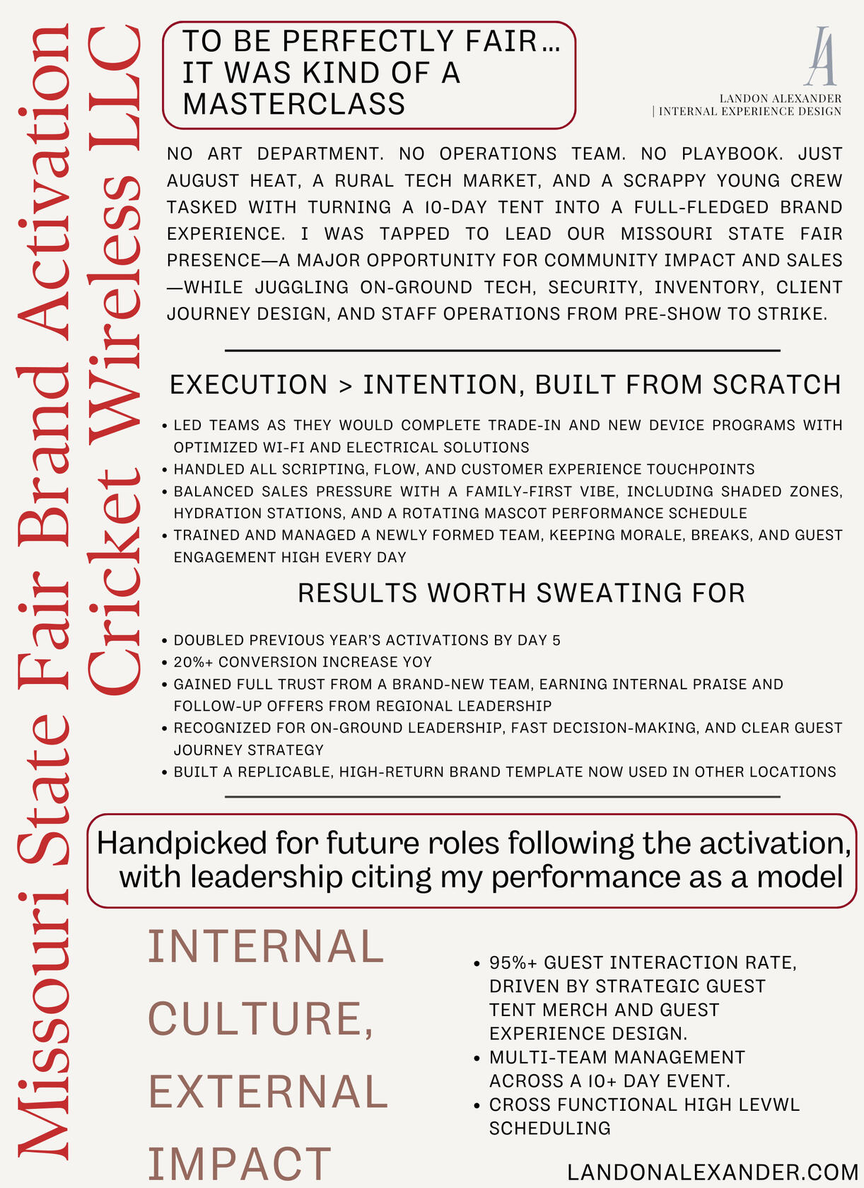 Spearheaded Cricket Wireless' presence at the Missouri State Fair, engaging over 30,000+ attendees across the event duration.Created and delivered daily promotions, community partnerships, and live event programming that boosted customer acquisition.Increased brand visibility and regional sales by double digits, strengthening market presence post-activation.