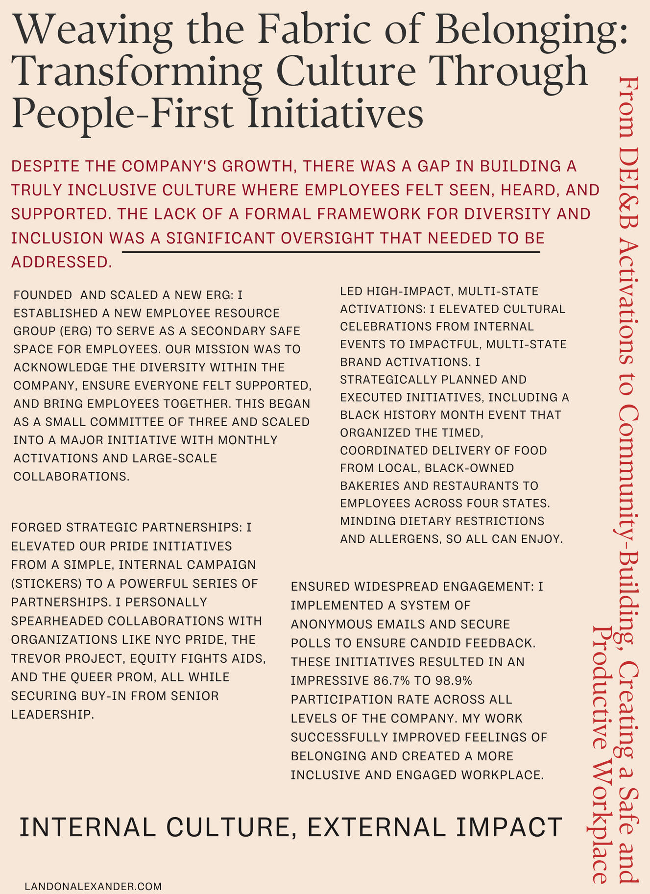 Results-driven solutions that have been vetted and validated-Proven in high-pressure launches, multi-state activations, and company-wide initiatives. The strategies I create are smart, forward-thinking, and anchored to your north stars. Each case study demonstrates how I translate culture into measurable results: stronger retention, faster team ramp-up, and performance-driven workplaces. This is the ROI of people-first design in action.